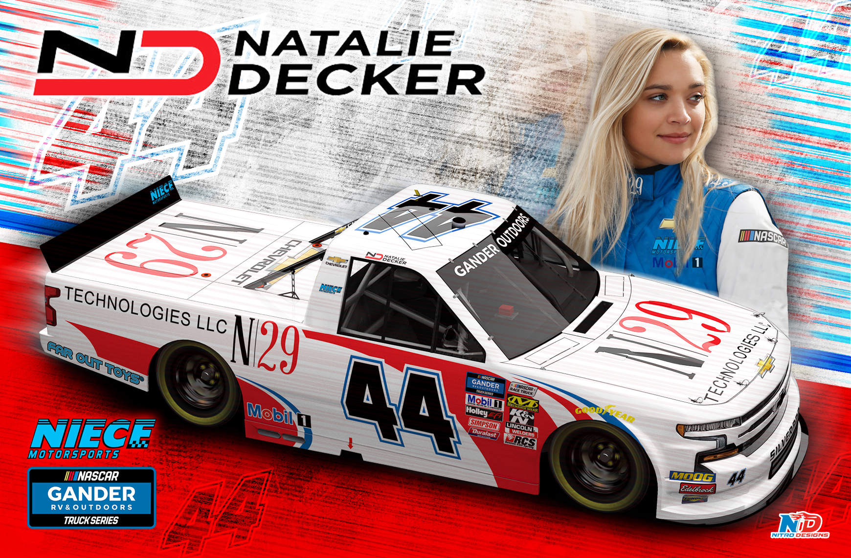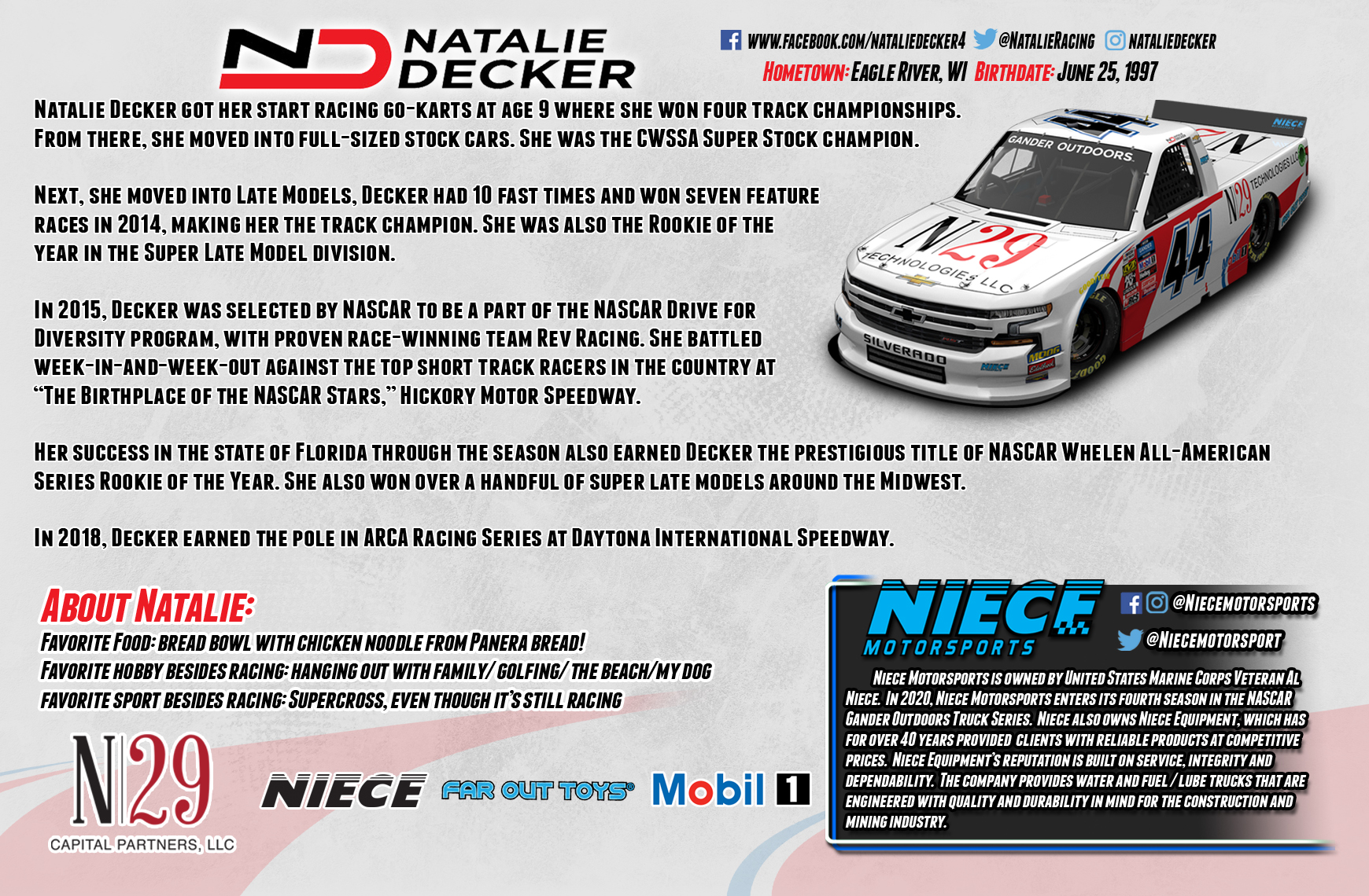 Racing hero cards for Natalie Decker and Niece Motorsports for the 2020 NASCAR Gander Outdoor & RV Truck Series season.